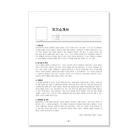Page1 : 이력서(앞) Page2 : 이력서(뒤) Page3 : 자기소개서 ... 본인만의 스토리를 작성할 수 있는 자기소개서 양식