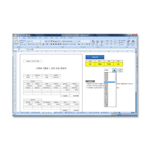 임직원별로 지급할 급여명세서를 선택적으로 출력할 수 있는 시트입니다. 순차적 또는 선별적으로 출력할 수 있도록 했으며, 프린터로 바로 출력하거나 pdf 파일 또는 기타 이미지 파일로 변환하는 등 사용자 환경에 맞게 이용할 수 있겠습니다.